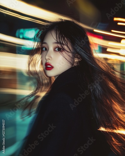 woman, night, beauty, people, person, fashion, city, hair, model, face, street, 1, urban, lady, blurred, artistic, blurry, motion, film, style, vintage, retro, long, red, asian, korean, japanese