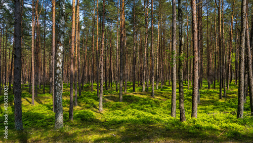 A beautiful landscape of a green forest with coniferous trees. Rays of sun pass through the pines. Grass spawns and plays with colors in sun