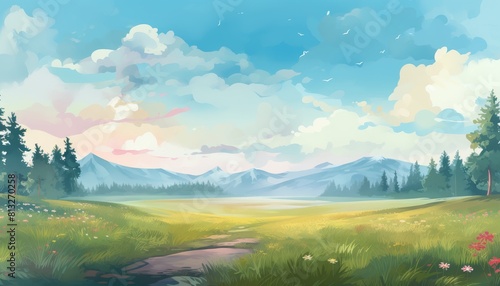 A beautiful landscape with a meadow, hills and mountains in the distance