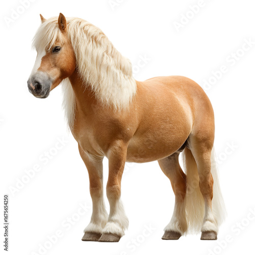 A beautiful light brown norwegian fjord horse with a flowing blonde mane standing proudly isolated on transparent background