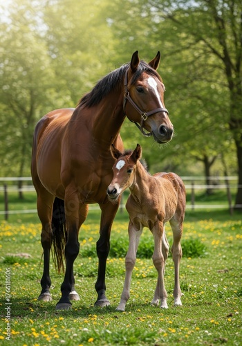 A beautiful mare standing protectively beside her newborn foal in a lush green pasture bathed in bright sunlight during the spring season ,new life ,farm ,birth