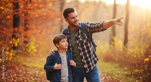 father, son, family, love, together, people, lifestyle, beautiful, aesthetic, realistic, photorealistic, cinematic, heartwarming, hiking, autumn, nature, adventure, exploration
