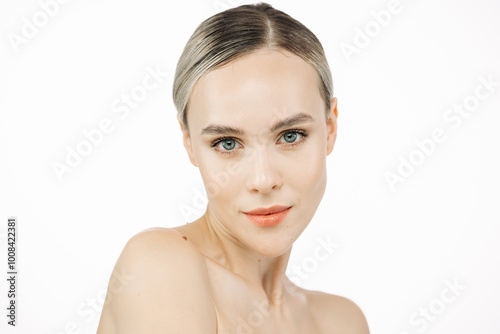 A beautiful model with flawless, fresh skin stands against a white background. This image highlights the significance of skincare and showcases a concept for cosmetic advertising.