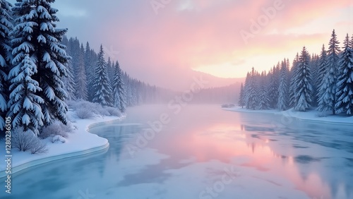 winter, landscape, snow, river, glacé, ice, pine, forest, tree, nature, cold, serene, peaceful, sunset, pastel, sky, pink, orange, blue, white, mist, frost, calmness, scenic, beauty, wonder, wilderness, calm, soft, glow, snowy, mountain, horizon, crisp, fresh, quiet, dreamy