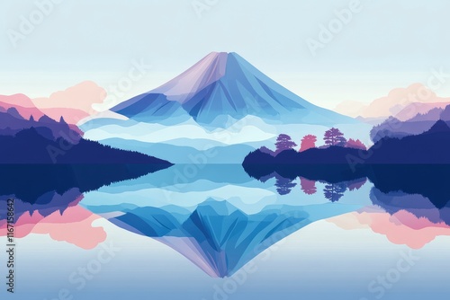 A beautiful photograph of Mount Fuji with its reflection on the lake, a blue sky, and a minimalist style. The image is high resolution, high quality, and high in detail, with a sharp focus and no blur