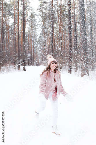 A beautiful pretty young girl with curly hair and a snow-white smile in a pink fur coat is walking and fooling around in the winter forest against the background of snow and trees, enjoy