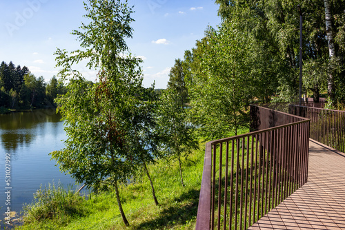 A beautiful promenade overlooking the lake, wooden walkways with railings. Pond on Stradalovka in Balabanovo, Russia