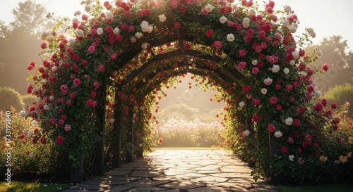 A beautiful rose archway with pink and white roses, leading to a stone path in a lush garden with trees and bushes in the background.