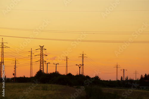 A beautiful row of power lines gracefully stretches across a field at the enchanting moment of sunset, creating a captivating scene