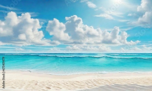A Beautiful Sandy Beach with Pristine White Sand, Caressed by Calm Turquoise Waves under the Sun's Warm Embrace, All Set Against a Backdrop of White Clouds in a Blue Sky – A Perfect Panoramic Landscap
