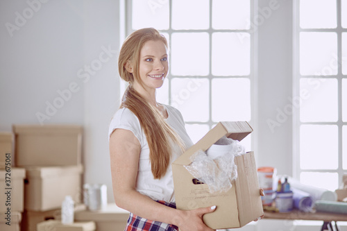 A beautiful single young woman unpacking boxes and moving into a new home