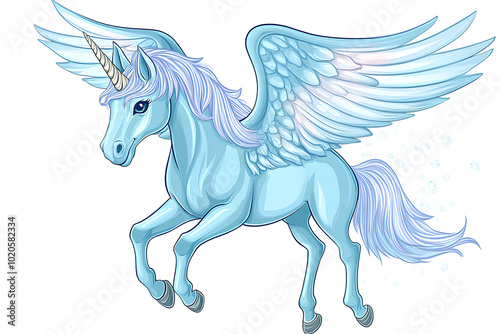 A beautiful sky blue unicorn. The large spreading wings of the unicorn are carried high into the sky. A magical and mysterious horse with wings and a horn, illustration