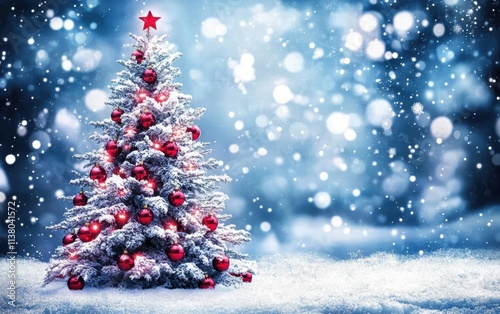 A beautiful snowy Christmas tree adorned with red ornaments, glowing in a magical winter wonderland ambiance.