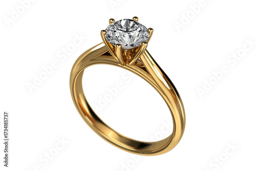 A beautiful solitaire diamond engagement ring with a yellow gold band, isolated on transparent background