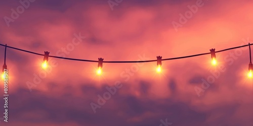 A beautiful string of warm glowing lights set against the purples and pinks of a twilight sky, emanating a cozy ambiance