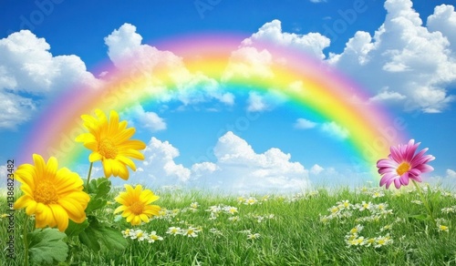sky, cloud, rainbow, flower, grass, meadow, sunshine, nature, bright, vibrant, colourful, sunny, blossom, bloom, daisy, yellow, pink, green, white, landscape, beauty, summer, spring, environment, idylli, cheerful, happiness, serenity, peace, growth, fresh, clear, tranquil, light, airy, scene, background, image, illustration, artwork, field, season, natural, open, harmony, joy, positive