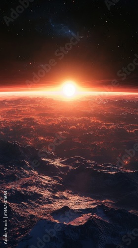 space, planet, sunrise, sun, light, cloud, horizon, atmosphere, star, star, sky, night, galaxy, nebula, celestial, cosmic, distant, mountain, mountain, terrain, surface, landscape, view, top, up high, dawn, dusk, orange, red, glow, bright, warm, dark, texture, rocky, abstract, elevation, extraterrestrial, remote, epic, scenic, artistic, dramatic, fantasy, high-coloured, fiery