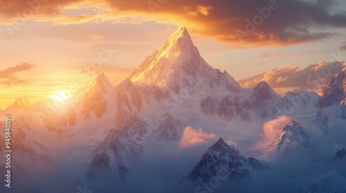 A beautiful sunrise over a snow-covered mountain range, casting golden hues on the peaks.