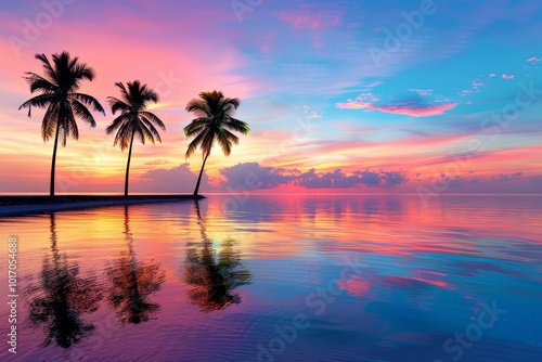 beautiful, sunset, ocean, palm, tree, foreground, sky, pink, purple, hue, sea, mix, serene, calm, summer, travel, tropical, beach, creating, atmosphere, sun, landscape, island, water, paradise, still, vacation, silhouette, exotic, evening, coast, sunrise, nature, red, horizon, coconut, dusk, cloud, background, blue, orange, yellow, scene, seascape, dream, night, colourful, holiday, caribbean