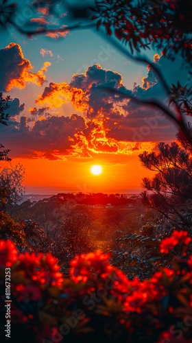 A beautiful sunset with red flowers in the foreground.