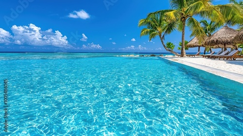 A beautiful tropical poolside view with palm trees and crystal-clear water, representing luxury relaxation