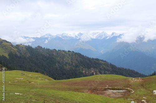 mountain, landscape, sky, mountain, nature, green, grass, hill, view, summer, cloud, blue, meadow, travel, panorama, forest, peak, tree, vale, rock, cloud, alps, beautiful, tour tourism, snow, lake, india, hike, trek, hiking, trekking, cold, cool, morning, scenic, scenery