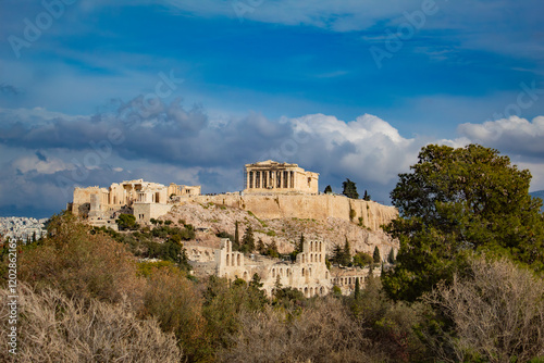 a beautiful view of the Acropolis of Athens, the Parthenon, against the background of a fabulous sky, among green trees