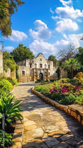 alamo, antonio, historic, garden, architecture, flower, blue, sky, travel, sightseeing, texas, tour tourism, landscape, scenery, culture, history, visitor, attraction, vibrant, path, stone, building, nature, greenery, holiday maker, heritage, palm, tree, sunny, site, peaceful, beautiful, day, cloud, colourful, exploration, relaxation, southern, destination, calmness, space, landmark, scenic