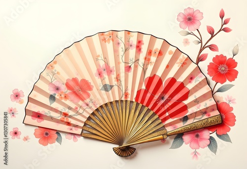 A beautiful vintage hand fan with a floral design, wooden sticks and gold accents.