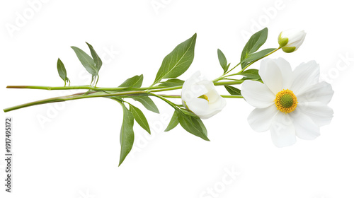A beautiful white flower branch with green leaves on a white isolated background.