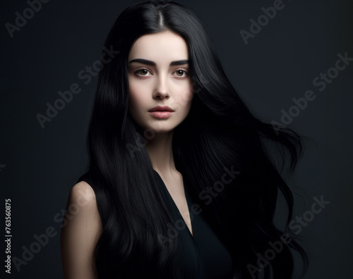 a beautiful woman blowing her long black hair on a grey background, concept of Beauty and hair care with keratin. Generative AI.