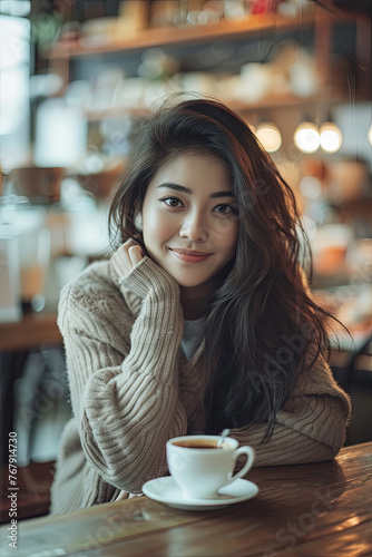 asian, chinese, japanese, korean, face, expression, smile, happiness, cafes, hot drink, eatery, cup, drink, people, smiling, person, beverage, lifestyle, sitting, table, model, woman, beautiful, pretty, lady, female