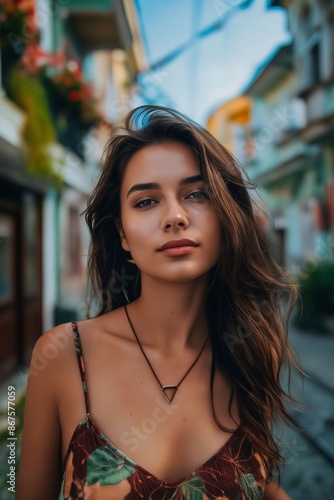 human, face, person, building, lady, long, hair, photo, shoot, female, clothing, model, fashion, accessory, girl, bra, abdomen, woman, wearing, dress, street, alley, beautiful, bikini, top, brunette, necklace, pose, racked, stare, wear, floral, standing, crowded