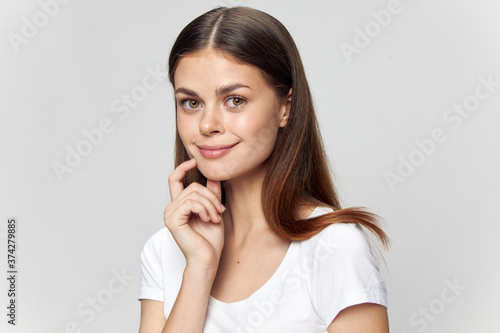 A beautiful woman in a white T-shirt holds her hand near her face and a beautiful smile joy
