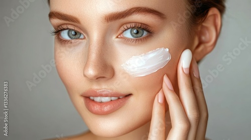face, cream, skincare, beauty, woman, portrait, skin, healthy, application, cosmetic, treatment, moisturise, facial, care, smooth, radiant, glow, touch, finger, nail, honed, texture, closeup, eye, eyebrow, eyelash, lip, smile, cheek, nose, forehead, white, soft, hydratation, nourishment, protection, hand, elegance, natural, light, fresh, make-up, looking, cheerful