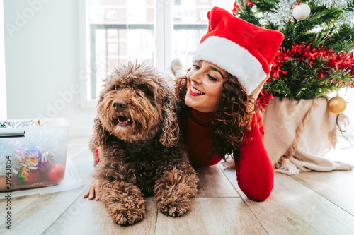 A beautiful woman lying down on the floor with her Spanish water dog in a Christmas holidays . She is looking at her pet with love. She is wearing a Santa Claus hat. Family dog Christmas tree concept