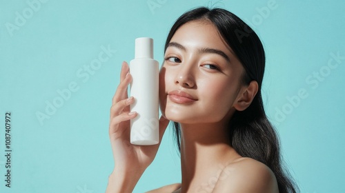 a beautiful woman on blue of background, holding a white empty shampoo bottle