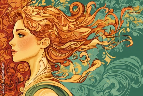 woman, portrait, hair, face, profile, side, view, illustration, artwork, orange, blood-red, gold, teal, background, design, style, pattern, detail, line, flowing, elegant, skin, reddening, lip, eye, curl, wave, artistic, fantasy, grace, beauty, drawing, decorative, ornament, flourish, graphic, composition, vibrant, aesthetic, serene, calm, attractive, shape, form, highlight, shades, texture, light
