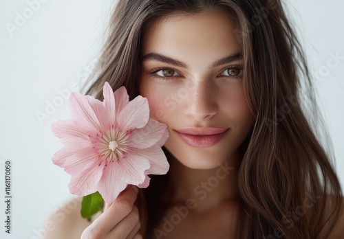 A beautiful woman with a pink flower in her hand, against a white background, with long brown hair and bright makeup