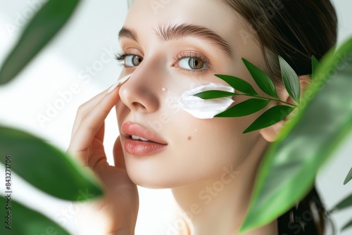 A beautiful woman with clean, healthy skin was applying cream to her cheeks against a white background with green leaves next to her hands. Skincare concept, beauty concept