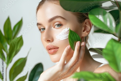 A beautiful woman with clean, healthy skin was applying cream to her cheeks against a white background with green leaves next to her hands. Skincare concept, beauty concept