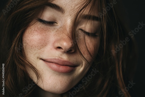 A beautiful woman with freckles and closed eyes, radiating a sense of peace and contentment.