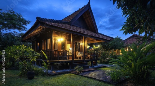 wood, cabin, house, home, architecture, building, exterior, porch, deck, garden, grass, tree, plant, nature, lighting, dusk, twilight, night, sky, blue, cloud, roof, tile, traditional, design, tranquil, calm, serene, peaceful, pathway, paseo, furniture, chair, table, foliage, tropical, resort, luxury, get-away, vacation, idylli, charming, cosy, warm, ambience, estate, residential