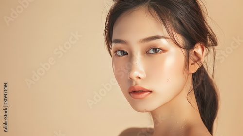 A beautiful young Asian woman with clean, fresh skin on a beige background. Her radiant complexion highlights the importance of face care, facial treatments, and cosmetology. Perfect for beauty