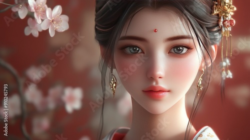 portrait, asian woman, beauty, elegance, grace, young adult, serene, cherry blossom, make-up, coiffure, fashion, tradition, oriental, female, artistic, romantic, charming, stunning, aethereal, natural beauty, closeup, cultural, whimsical, warm tones, flower, beautification, face, character, stylised, expression, youthful, iconic, captivating, mesmerizing, harmonious