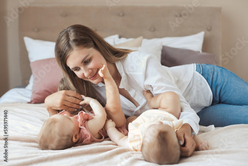 A beautiful young mother spends time with her little twin daughters, cares and plays with them on the bed at home
