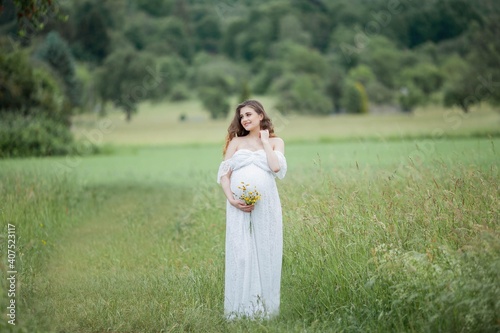 A beautiful young pregnant woman with curly long hair in a white dress walks in the field. Spring portrait of a pregnant woman. Happy pregnancy.