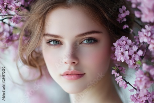 A beautiful young woman with blue eyes surrounded by pink flowers, great for beauty or lifestyle ads
