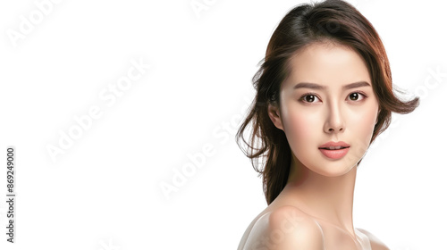 A beautiful young woman with long dark hair looks directly at the camera with a soft smile