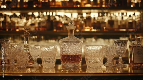 A beautifully arranged collection of crystal glassware and a decanter on a bar counter.